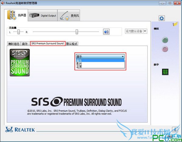 4、在弹出的管理器中,点击如下图所示的“SRS Premium Surround Sound”选项,即可使用SRS音效了。默认条件下为“音乐”模式,可根据实际需求选择“影片”或“正常”模式进行工作。