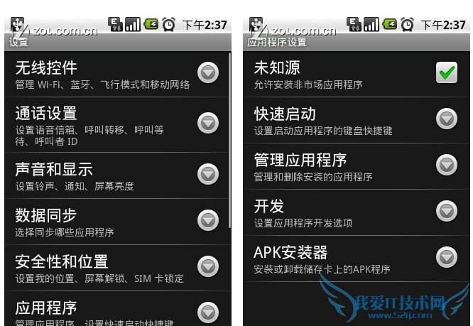 买了个G10手机,从网上下载了一些软件想装到手机里,发现.apk的不知道怎么装,在ANDROID平台下安装文件的后缀名为“.apk”,就好像PC上的安装文件的后缀名为“.exe”塞班平台安装文件的后缀名为“.sis”一样,所以我们一般称ANDROID平台下安装文件为“APK”。手机上首先要进行一些设置,设置——应用程序——勾选“未知源”