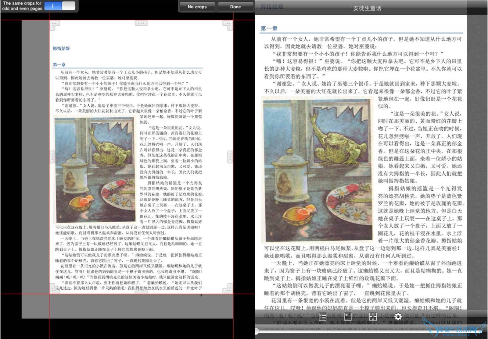 再来一张,左边是GoodReader中PDF裁白边的操做界面,需要手动裁四边,右边是Apabi Reader 中CEBX的裁白边效果,只需一键操作,完全自动: