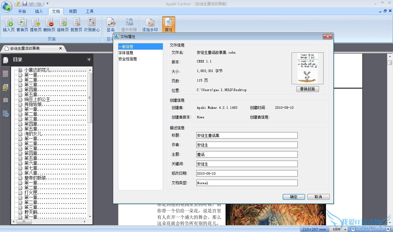 我们还可以点击“文档”——“属性”来给图书加上喜欢的封面,并修改文档的一些基本数据,比如说标题、作者、修改时间等等。
