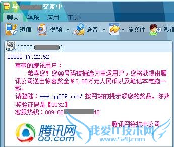 使用QQ聊天消息通知“腾讯与某公司合作举办‘黄金六月送’,随机抽奖送Q币或现金活动,您获得了二等奖价值20,000元的笔记本电脑一部(办理领奖费用只需875元)。