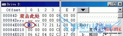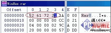 幸好WinHex装到C盘上了,启动后选“OpenDisk”打开D盘,在WinHex子窗口的表格内共有三个列,最左边的是偏移值,相当于行号;中间显示的是16进制代码,右边是每组代码对应显示的文字。因为无论是那种格式的文件开头都会有特定的标记,所以只要知道对应的代码就能知到文件的类型。由于我D盘上大部分是RAR压缩格式的文件,所以我先用WinRar创建一个rar文件,再用WinHex打开,在右边开头显示出Rar!字样(图1),对应的16进制的值就是“52 61 72 21”,一同选中后按“Ctrl+Shift+C”把这串代码复制到剪贴板,
