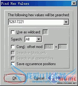 然后切换到刚才打开D盘的窗口,依次选择 “Search >> Find Hex Values”,按“Ctrl+V”或在输入框内点右键选择“粘贴”,确认无误后点“OK”开始搜索。