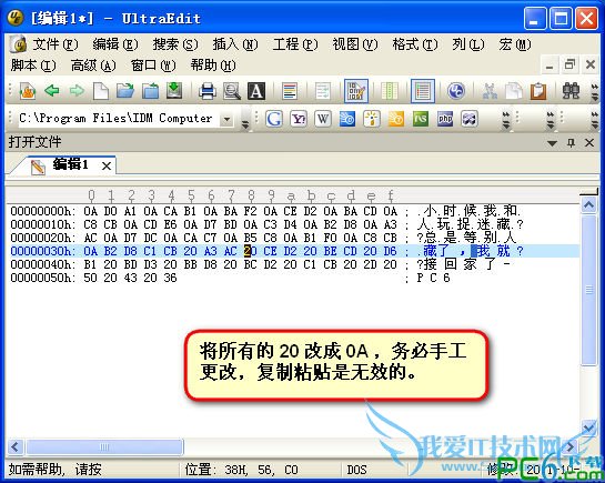 然后按Ctrl+H,将名字转换成16进制,这时候你会发现有几个20,那就是我们刚才输入的空格代码。接着用0A这个代码替换20。