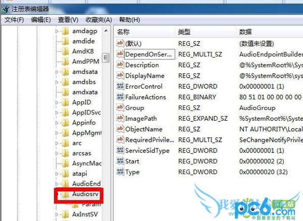 2.找到HKEY_LOCAL_MACHINE/SYSTEM/CurrentControlSet/Services/Audiosrv然后双击打开。