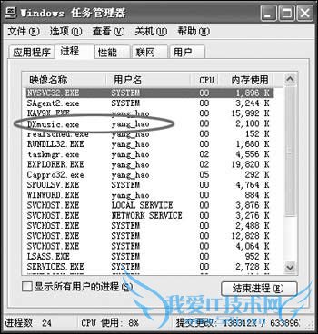 我不经意地用[Ctrl+Alt+Del]打开“系统进程”窗口,发现里面多了个不认识的“Dxmusic.exe”进程(如图)。将其终止掉,Media Player竟然恢复正常了。问题在这里?我又通过“Msconfig”查看系统的启动项,没有发现里面有和“Dxmusic.exe”相关的启动项。看来就是它了!在网上查找,果然找到了相关资料 。