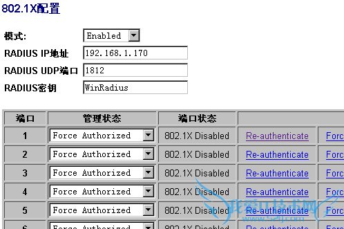 实现网络准入控制,S2524G的设置方法很简单,分别需要在交换机上设置和配置radius服务器。如上图,我们配置了802.1x,只需要填写radius服务器地址和密钥即可。接下来需要配置端口状态,共有三种状态,Auto、force authorized和force unauthorized。Auto指端口根据认证成功与否开启或关闭相应端口,force authorized指端口始终打开,而不进行验证,force unauthorized指端口始终关闭,不响应用户请求。默认为force authorized,我们将15端口修改成了Auto。