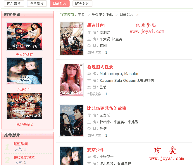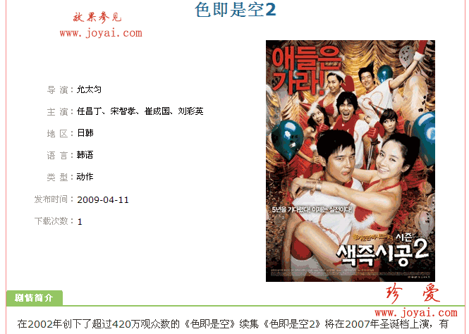 第五步:修改其它的相应细节,这样就完成了电影站的模板的改造,完成后的效果请参见珍爱www.joyai.com中的免费电影下载栏目,对于一般的电影站应该是最适合的最好的CMS模板了。
