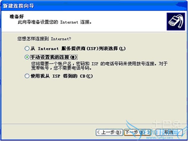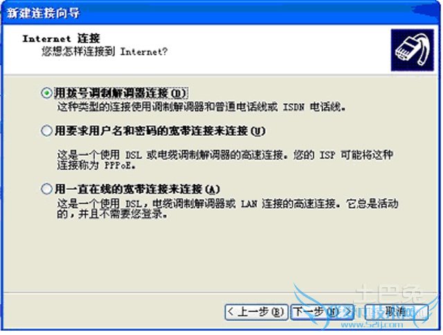 第一步我们打开网络连接文件夹,这个就从开始/控制面板/网络和Internet连接/网络连接,这样我们就打开了网络连接文件夹。下面我们就点击新建连接这个选项,在弹出的对话框中我们选择下一步,点选“连接到Internet(C)”然后再选择“手动设置我的连接(M)”这个选项。到下一个环节我们就可以看到一个选择,这里我们就选择“用拨号调制解调器连接(D)”这个选项。