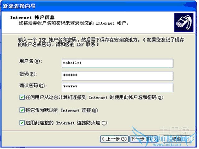 下面我们就看到连接名的对话框,这里可以设置也可以不设置。到下面一个对话框,这里会出现三个部分的内容需要填写,就是用户名跟密码之类的。对于这个用户名跟密码来说,是网通的人员给你们提供的。当我们填写好之后就可以进入下一个环节了。