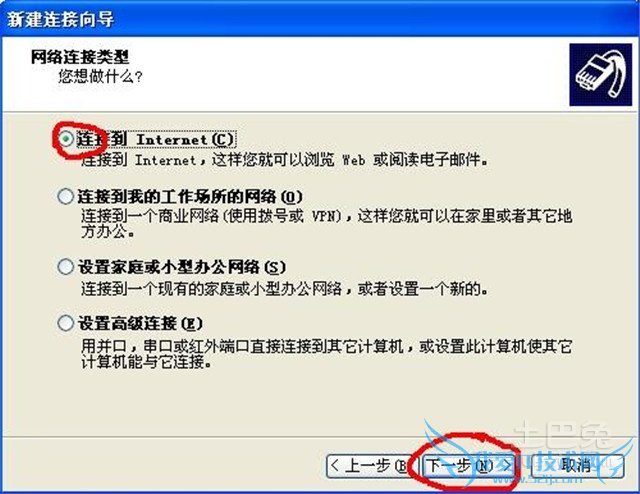 ③选择“连接到Internet”,点击“下一步”;