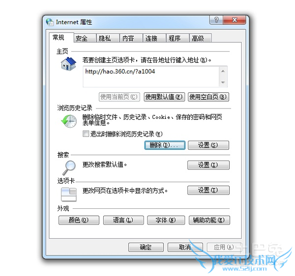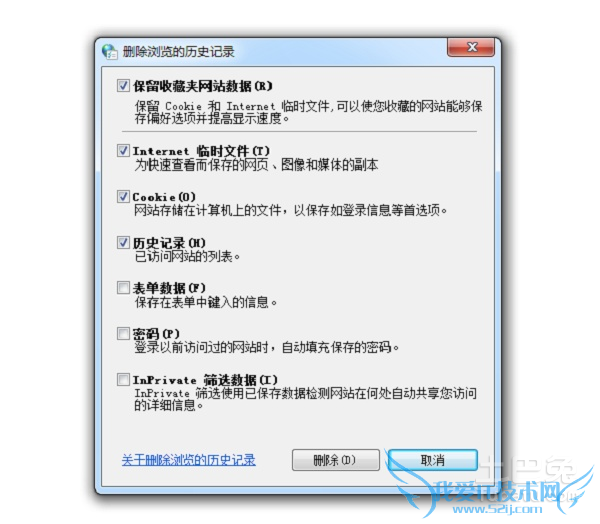 同样我们和ie6一样找到internet属性,之后在弹出的对话框里面,选择常规,之后在中间部位我们选择删除,之后还会弹出一个对话框,会显示一些我们需要删除的浏览的历史记录,我们需要删除临时文件,还是cookies,以及密码等等都可以选择,我们选择好之后把前面勾上对勾之后点击删除。