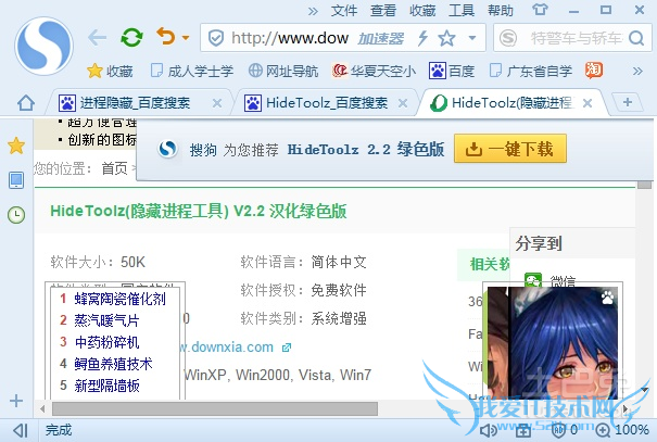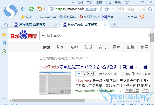 ①现在打开你的浏览器,推荐使用的浏览器是搜狗,速度比较快。打开搜狗里面找到百度一下。在百度上的搜索栏里输入HideToolz,回车进行搜索。一般搜索出来的前面几个就是可以下载的。自己掂量着,打开一个进行下载,一般选择第一个。要保存在自己找得到的盘里,如果不知道保存在那个盘可以选择保存在桌面上。