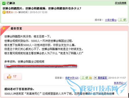 这里,我想说是如何在百度知道中借助热门事件来推广自己的网站。我也是今天在群里听到大家说起这个话题的,当时群里面中所纷纭,于是我就想到在网上搜索下相关信息,了解下具体情况,在百度上输入“世博会踩踏事件”,结果出来的第一条是百度知道里面的一个相关问题,点击去看后,如图: