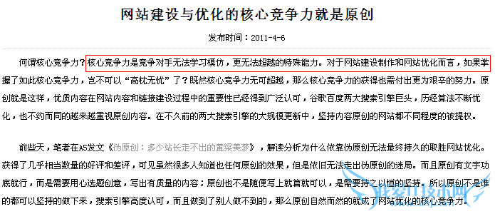 透过一些现象,更加坚信了笔者的观点。不同质量的原创文章给网站带来了不同的权重,而网站的整体权重也是在此过程中不断慢慢累积而来。不知道有多人还在围绕优化而坚持不懈的原创,也不知道还有多少人用心的坚持以质取胜。笔者一直追踪分析网站建设业内秦皇岛一个网络公司的网站,虽然通过核心词检索这个网站排名多非常靠前,但是实事求是的说,原创的并不用心,而更多的是像告诉搜索引擎我在坚持原创了。那么从用户抑或搜索引擎的角度分析,什么样的原创才是有质量的呢?换个场景思考,原创其实就像高考时的作文一样,好的文章一定是吻合主题,立意新颖且中心思想明确。