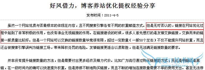 为了让搜索引擎更深入的检索网站内容,笔者前几天对网站的文章版本做了一次不小的改动。增加了文章页的DESCRITION内容描述部分,在文章的开始(左侧)及下方,增加了相关阅读链接,采用的方式是通过程序随机从数据库里面读取已经发布的内容。如此改动,竟然一下就让搜索引擎找不到方向了,先是发布的原创内容,自认为花了很多心思写的还不错的内容,却始终不予收录。部分收录的内容,也不是采用提交的网页内容描述的文字,而是随机乱抓网页靠前面的一些内容。搜索引擎历经将近一个星期的的不断调整,现在终于可以及时收网站新发布的内容录了。这个过程,笔者也发现一个有趣现象,就是现在搜索引擎抓取到的内容,基本上都可以概括文字的中心。那么我们不尽思考,是不是一篇文章里面如果能出现一段可以概括文章中心的段落,就更方便搜索引擎检索,从而有效提升内容权重呢?