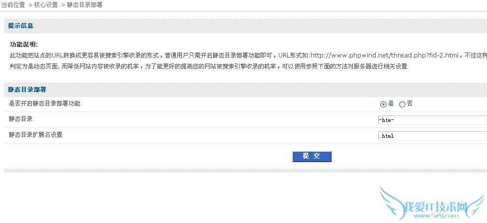 进入phpwind后台,核心设置中的静态目录部署页,如图: