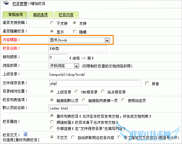 接下来我们就可以来添加一个栏目,在栏目设置中将栏目的内容模型设置为图书