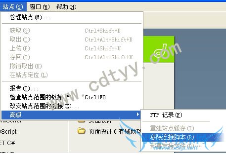 第三步,回到Dreamweaver程序,打开“站点”菜单,在下拉菜单中选择“高级”,然后点“移除连接脚本”,成功删除连接脚本。关闭Dreamweaver,重新打开软件。再试试,现在是不是可以任意连接到表格了。