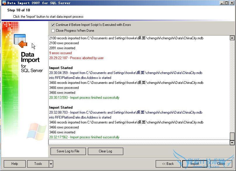 我的服务器是SQL Server Express 版本的,附带的Express版本的SQL管理器并没有导入其他数据库数据的功能。大家可以下载一个Data Import 2007 for Sql Server,它是EMS for Sql Server其中的一个小程序。但是EMS for Sql Server注册版很难找到,但是Data Import却让我找到了它的破解版。他们的区别是:未注册的版本只能导入100条记录(全国城市数据库有3000多条记录)。