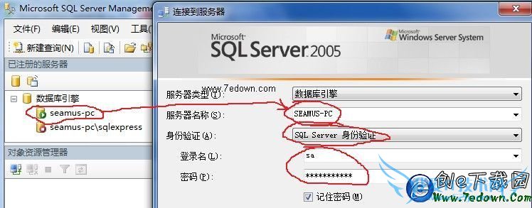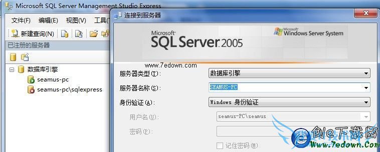 先关闭Microsoft SQL Server 2005->SQL Server Management Studio然后重新打开,按如下登录: