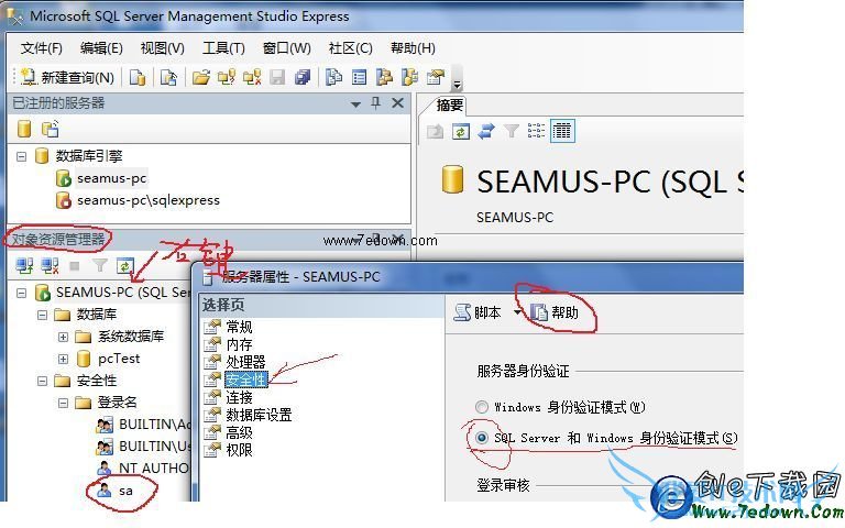 在对象资源管理器里右键服务器名称,出现【服务器属性】对知框,在安全性里面的设置如上图,如果不懂可以单击【帮助】,这比去网上找资料更方便也更权威!!