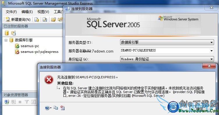 从上面这个图片我们看到seamus-pc这个服务已经启动,配置如图片的右部分所示,直接点登录就行。如果此时我把服务器的名称选为seamus-pc/sqlexpress登录就会出现如下错误,因为这个服务还没启动的,所以你当然就登录不上去了。