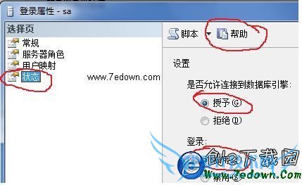 接下来就右键上图中的登录名sa->属性,出现一个【登录名属性】对话框,在【常规】选项卡里更改sa的登录密码,另外注意下这个页面里的默认数据库,也就是你登录服务后默认操纵的就是该数据库,当然如果你更改了这个默认数据库后你还得确保在【用户映射】选项卡里将该数据库勾选上。【状态】选项卡的配置如下: