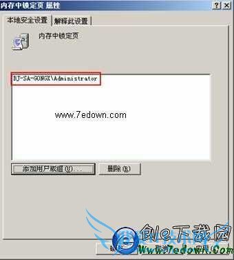 在“内存中锁定页”页面中新增用戶或组,加入SQL-SERVER服务的启动帐号(系统默认启动帐号是administrators。)