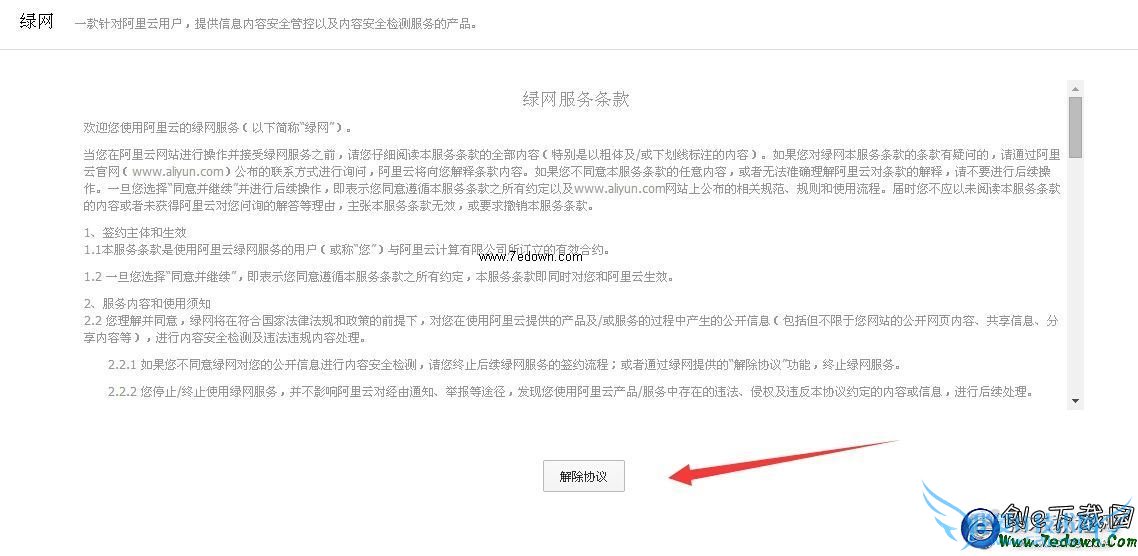 2、点击后,在点击解除协议即可成功关闭阿里云绿网功能啦