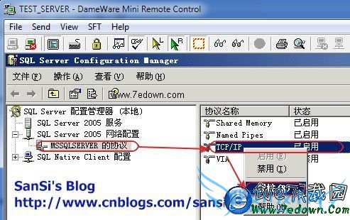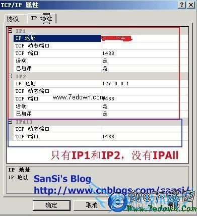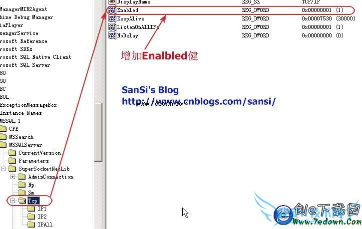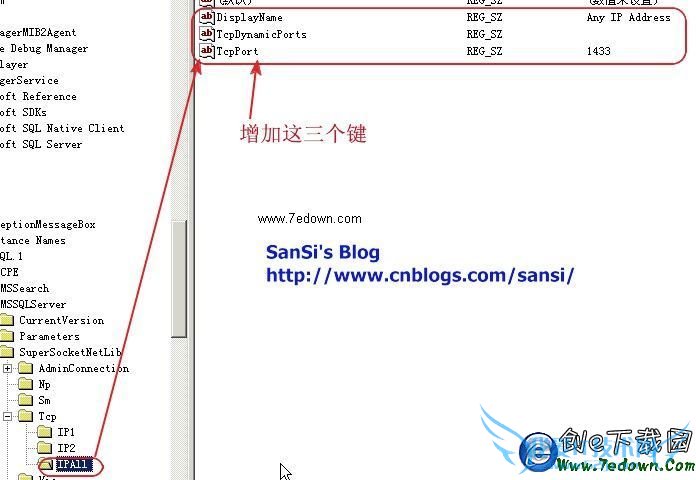 一、开始->运行->regedit,找到 HKEY_LOCAL_MACHINE\SOFTWARE\Microsoft\Microsoft SQL Server\MSSQL.1\MSSQLServer\SuperSocketNetLib\Tcp