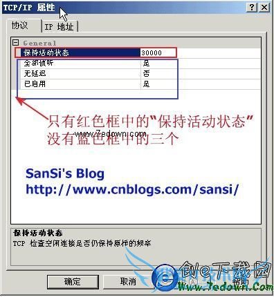 当你打开它的属性的时候,发现在“协议”那一栏,只有“保持活动状态”,其它三个都没有了。而在“IP 地址”栏,缺少IPALL。这个问题的解决办法是去注册表为TCP/IP增加丢失的项。如下图: