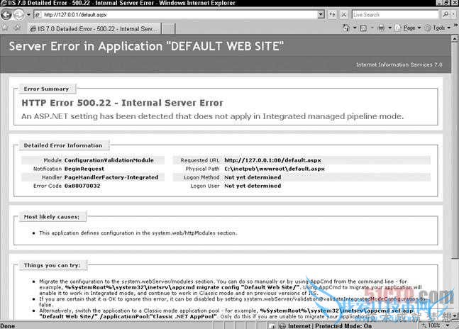 经典模式可以在无须修改web.config的前提下运行现有的Web网站,因此,如果使用的Web farm中既包括IIS 6.0服务器,也包括IIS 7.0服务器,或者因为某些原因无法将web.config文件转换为遵循新语法的web.config文件,那么就可以使用经典模式。
