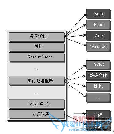 下图使用模块解释了IIS管道。这些模块原本是ASP.NET的组成部分,现在已经是IIS管道的有机组成部分。