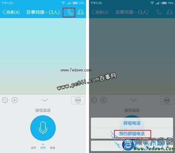 2,在其界面上方点击一个【电话】标识,在弹出来的页面选择【预约群组电话】,如下图所示: