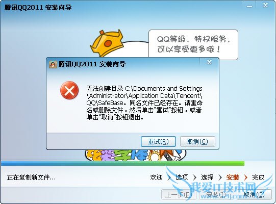 4、在安装那一步,卡住了,Mygod,一个从来没有碰到过的问题遇上了,真是衰,难道是衰哥了。错误如下:无法创建目录 C:\Documents and Settings\Administrator\Application Data\Tencent\QQ\SafeBase。同名文件已经存在。请重命名或删除文件,然后单击“重试”按钮,或者单击“取消”按钮退出。