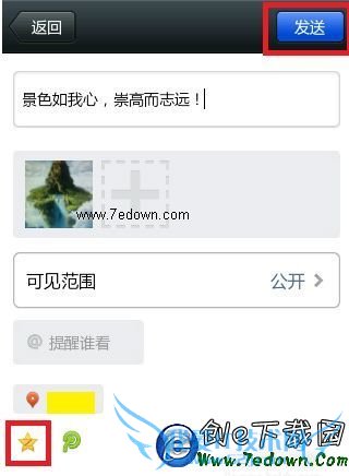 4、等到一些编辑好及点亮了同步后,就可以发送了。PS:需要同步到QQ空间或者腾讯微博的话只需要亲亲点击图片点亮即可。