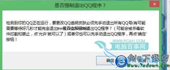 2,在使用之前,我们最好先退出QQ程序。当然了,在操作之前,该软件也会自动检测到我们的QQ在运行,提醒我们先退正在运行的QQ,点击确定,会强制退出我们的QQ,如下图。