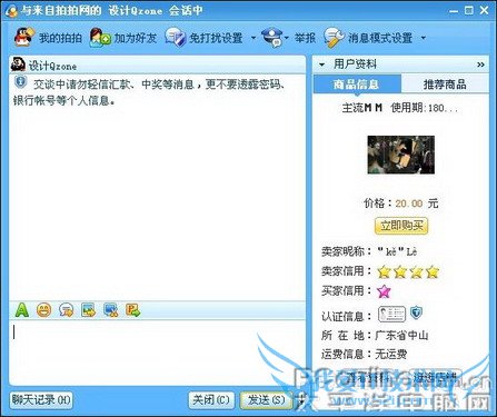 拍拍网提供的"临时会话"功能大大方便了买卖双方的沟通,在QQ2007 Beta2中对这一功能进行了优化,使得拍拍网环境下的临时会话表现更商务,这一新的临时会话窗口扩大了物品展示区,增加了"我的拍拍"按钮,并且优化了整体布局,让买卖双方沟通更顺畅。