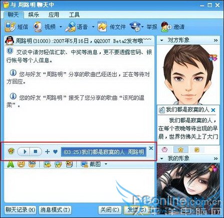 在QQ2007 Beta2音乐场景内优化了音乐分享体验,您只要通过点击聊天窗口工具栏的音乐场景按钮,即可看到音乐分享窗口,选择您喜爱的歌曲就可以与好友分享了,您可以一边聊天,一边选择歌曲。还可以将收藏歌曲,QQMusic海量的正版音乐等你来分享,还犹豫什么呢,赶快与好友一起分享吧。