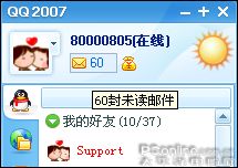 QQ2007 Beta2优化了QQ邮箱的邮件到达通知,新的交互体验让您更便捷地处理邮件,更及时地关注新邮件信息。您不仅可以通过主面板的邮件图标看到多少封未读邮件,还可以在系统状态栏的QQ图标位置点击处理最新的邮件。