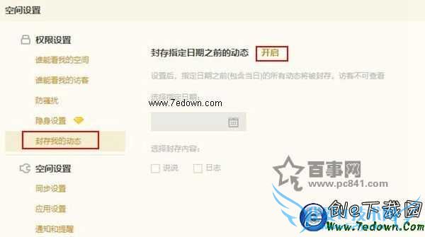 2,在空间设置页面下方找到“权限设置”,在其下方找到“封存我的动态”字样,然后点击“封存指定日期之前的动态”开启图标,如下图所示
