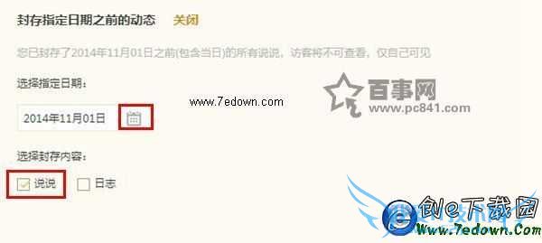 3,最后,选择需要隐藏动态的日期,需要注意的是隐藏动态的日期必须是1个月以前的,例如今日是12月26日,那么我们只能封存(隐藏)到11月25号之前的动态说说。接着在需要封存的内容前打勾即可(可以选择说说和日志),如下图所示