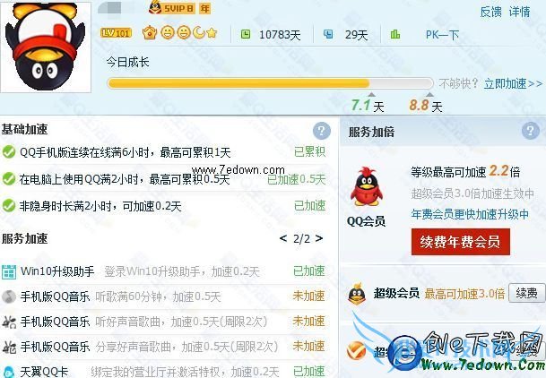 大家可以看到QQ客户端截图显示,手机版QQ音乐最多可加速1.5天,如果榜样营业厅激活特权,也就是开通天翼QQ卡,又可以获得0.2天加速,如果你完成了所有服务加速的任务,即可获得QQ8.8天加速!是不是很火爆?!