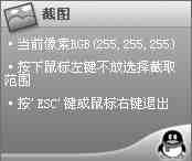 爱好制作网页的朋友往往都会安装一些用于提取屏幕上某区域颜色的RGB值的软件,这样可以在自己制作的页面中借鉴。其实QQ就有这个功能啦!打开聊天窗口,同样是单击“捕捉屏幕”,拖动鼠标,将箭头停靠在要拾取颜色的区域,你会看到悬浮窗口中,有一个提示信息——类似“当前像素RGB(255,255,255)”(图3),将该值记下来,用到你的主页或者Photoshop中进行设置吧。