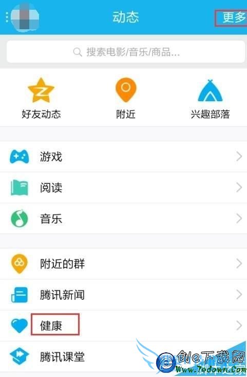 1、在qq端最下方动态里面找到qq健康,如果没有的话可以在右上角的更多里面添加。如下图所示: