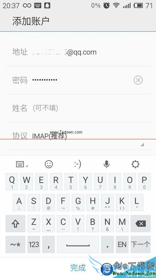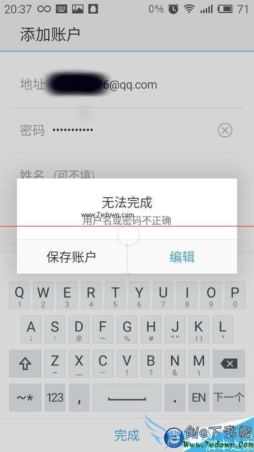 2、设置好独立登录密码了之后,回到魅蓝note手机,点击邮件,会显示让你填写用户名和密码,就填写你的QQ邮箱*******@qq.com和你的QQ邮箱独立登录密码,选择imap,点击完成,登录,这时候就会提示用户名或密码错误,别急,让我们点击编辑!