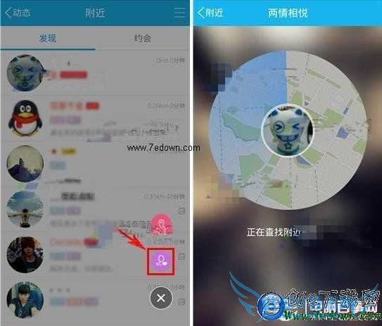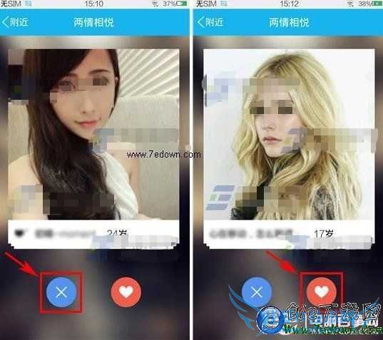 3,在搜寻到的附近的人中,如果自己不感兴趣,可以点击【×】换一个,如果遇到自己喜欢的,可以点击【爱心】对TA进行爆灯哦,如下图所示: