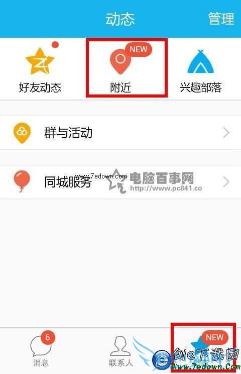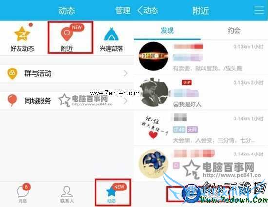 QQ“爆灯心动模式”只有手机QQ上才有,动态可以看到附近有新功能的标志,点击附近进入,如下图所示: