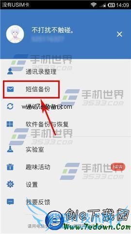 1)打开QQ同步助手,进入首页后点击左上角的【三】弹出菜单栏,选择【短信备份】一项。(如下图)